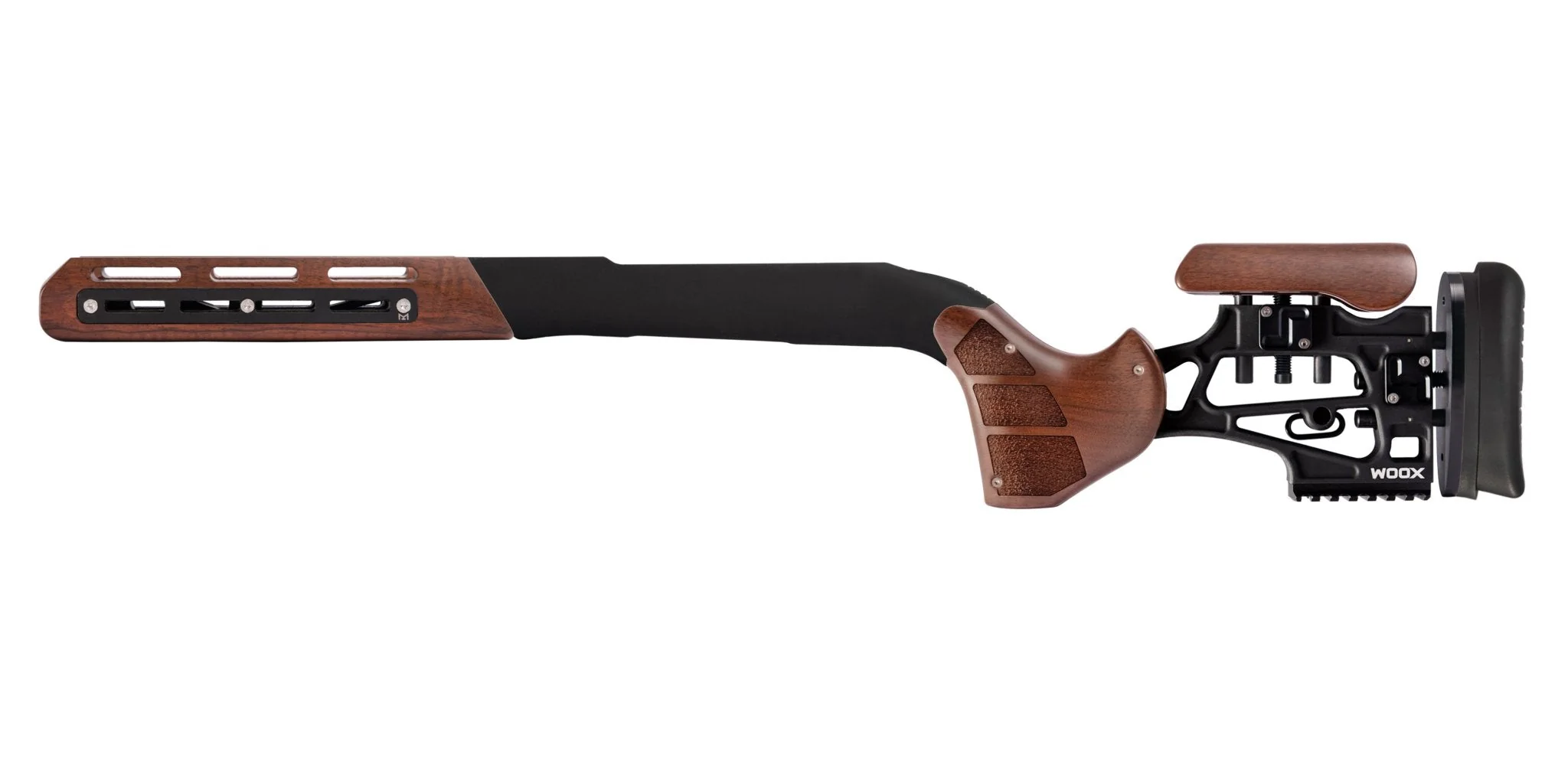 Stunning high-tech hybrid stock that combines wood sections over a full-length aerospace grade aluminum skeleton chassis.